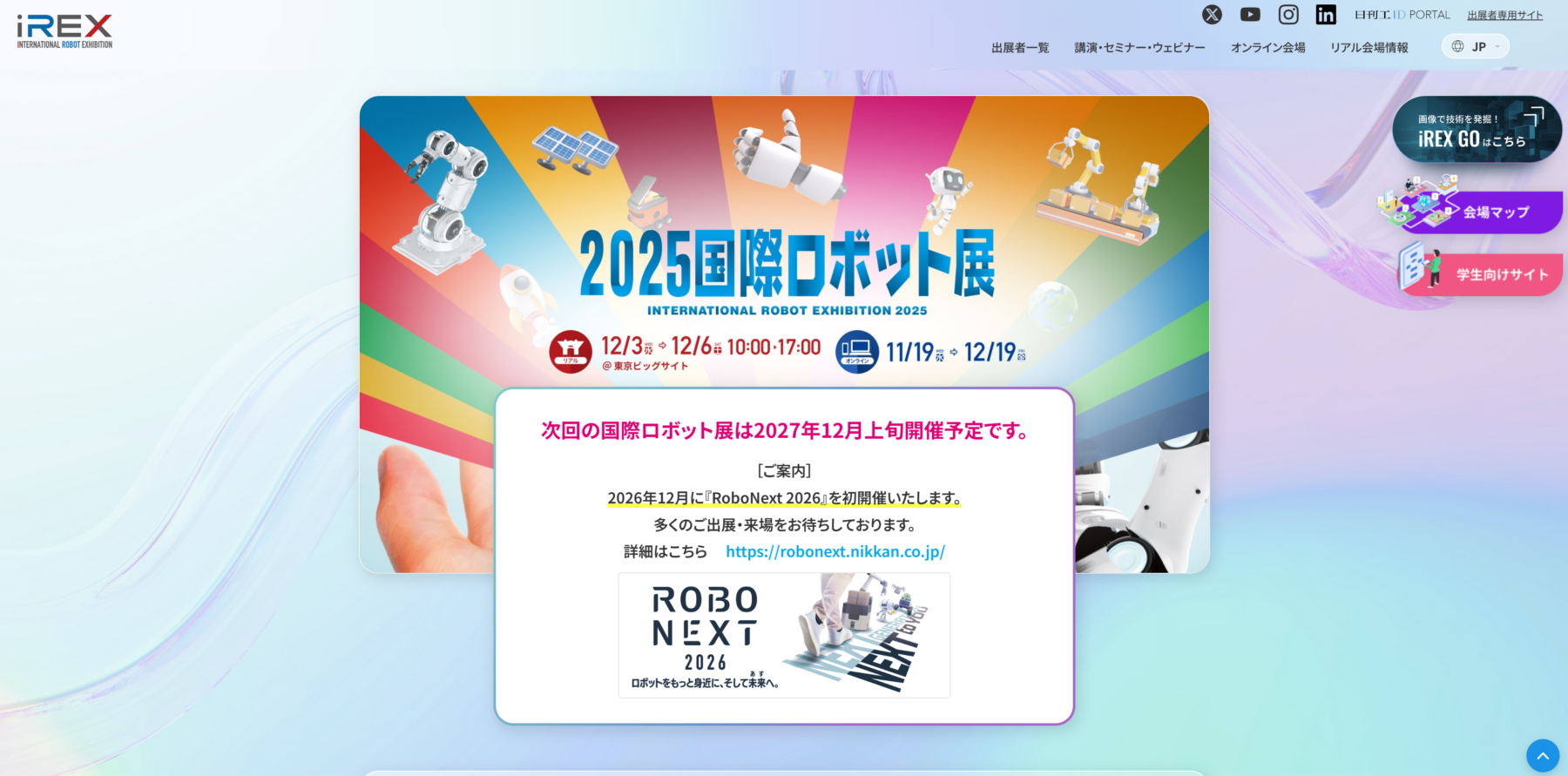 iREX(国際ロボット展)が2年に1度・東京開催であるのに対し、RoboNextは大阪で開催され、スタートアップ・ベンチャー企業や教育機関が参加できる「Next Generation」エリア、業界ユーザーと連携した「Next to you」エリアなども設けられ、より間口を広げた構成が特徴です。