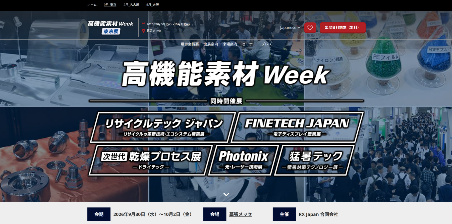 高機能素材Weekは、プラスチック、金属、セラミックス、接着・接合、フィルムなど、先端材料技術に特化した展示会です。機能性や軽量化、耐熱性、環境対応などのニーズに応える素材が集結し、研究・開発・製品化に携わる企業や技術者の注目を集めています。