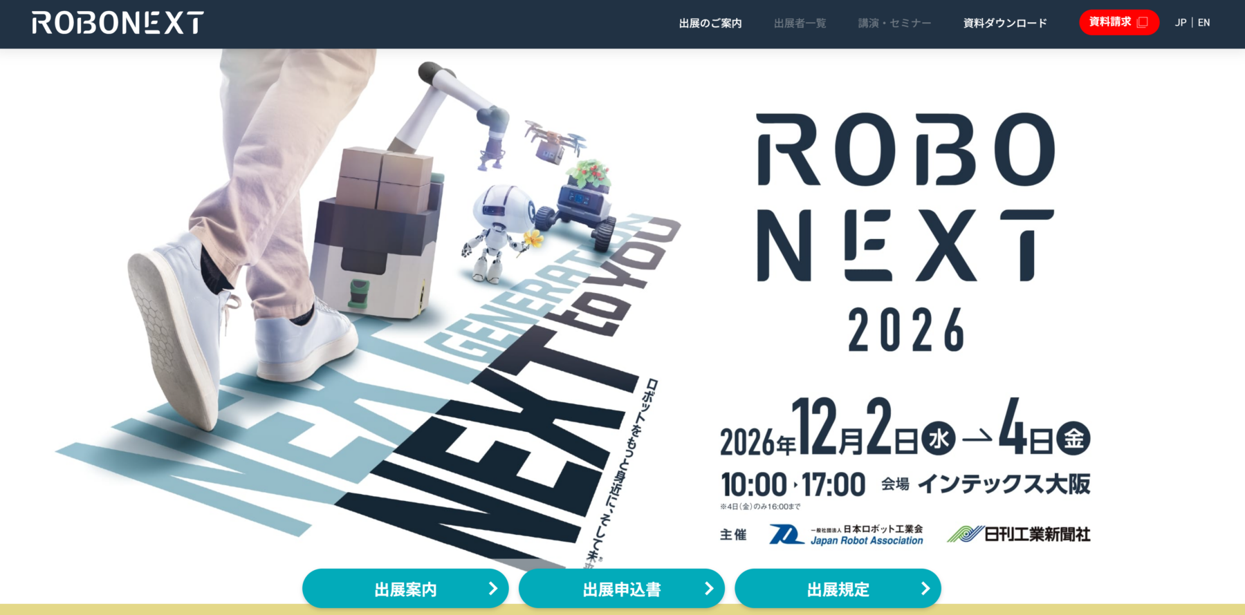 RoboNextは、世界最大級の「国際ロボット展」を主催する日本ロボット工業会と日刊工業新聞社が新たに立ち上げたロボット専門の展示会で、2026年に初開催されます。「ロボットをもっと身近に、そして未来へ」をテーマに、ロボット活用の可能性を広げ、多くの方がロボットに触れる場を目指しています。