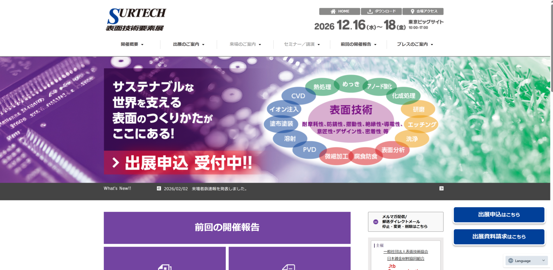 SURTECH(表面技術要素店)は、めっき、塗装、表面処理、コーティングなど、表面技術専門の展示会です。自動車、航空機、電子部品、医療機器など幅広い産業分野から来場があり、耐久性や機能性向上を実現する加工技術や設備が展示されます。