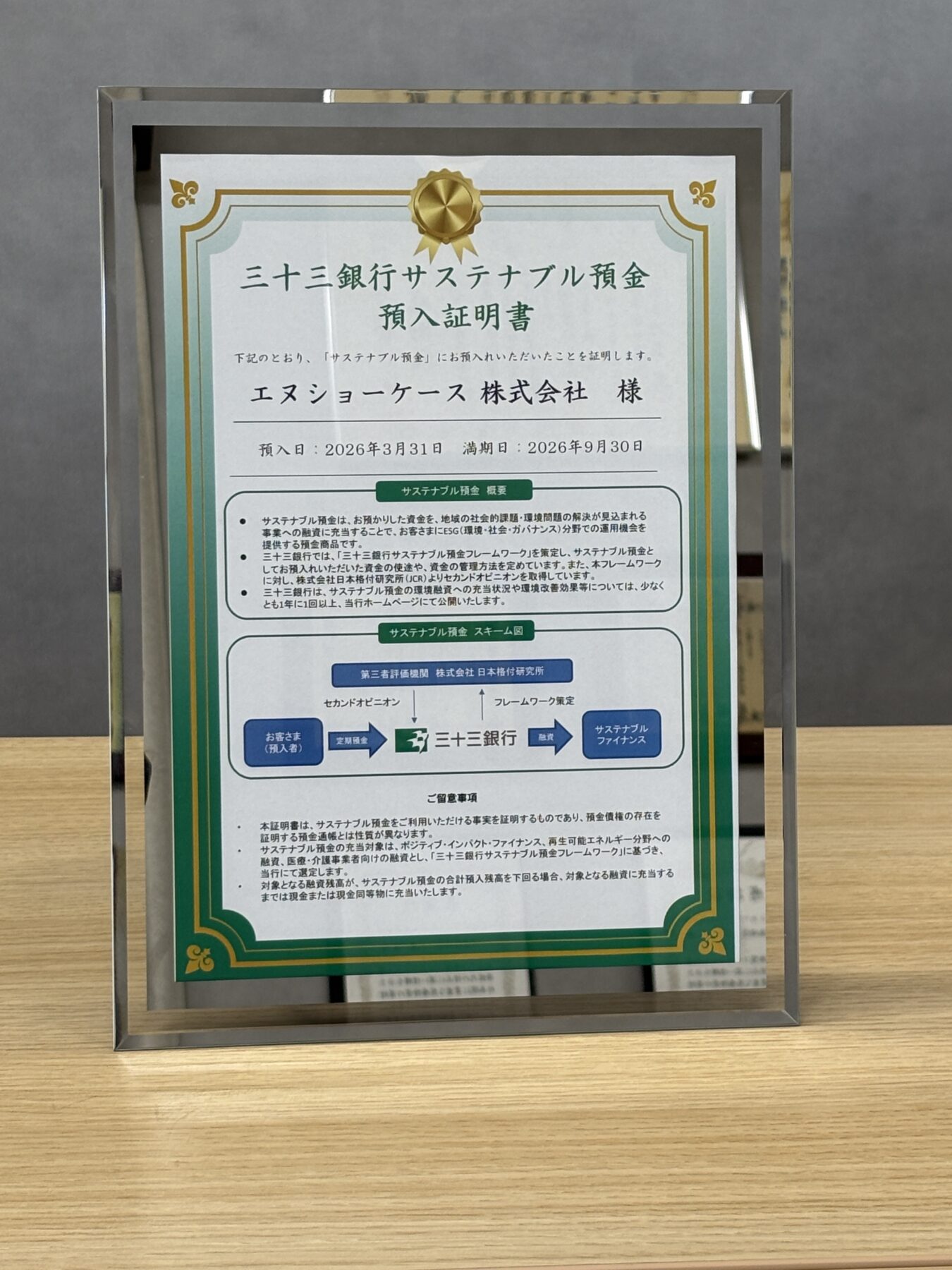 2026年3月31日に三十三銀行サステナブル預金への預入を実施いたしました。